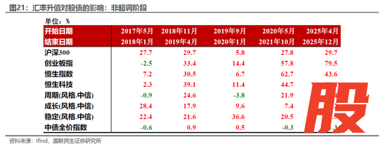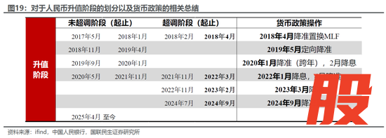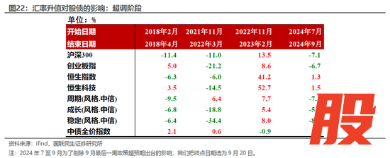 经过之前3年的经验,市场已经熟悉了汇率贬值会约束货币政策宽松,影响货币市场的超额流动性,以及拖累股市的情绪和风险偏好。那么如果翻转到升值的场景,会带来什么改变?我们把主要的汇率升值阶段分为非超调和超调阶段。
