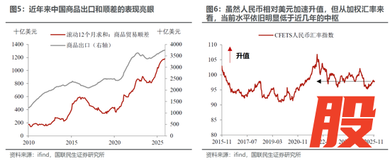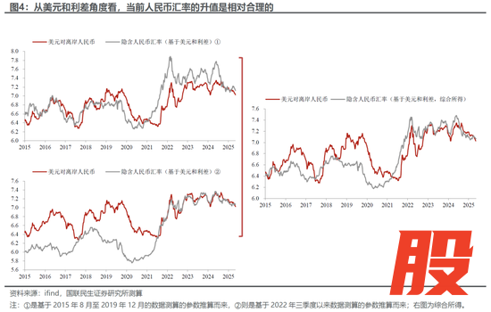 根据测算的结果,我们倾向于认为当前人民币升值的幅度是相对合理的。如果考虑到2025年前三个季度美元大幅贬值、而人民币相对稳定,最近一个多月的补涨也在情理之中。