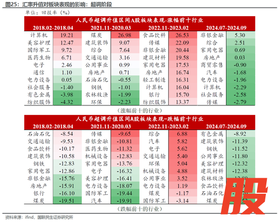 而对于汇率超调的阶段,则更加特殊。除了一些特殊场景触发的超调外(比如2022年底),整体市场的表现是比较平淡的、只有个别板块有所表现。当然站在当前,如果2026年能够出现因为美联储超预期大幅降息带来的人民币升值,那市场的风格特点可以参考2019年初,依旧会有不小的空间和弹性。