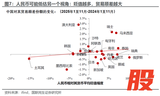 第二个维度是贸易维度。这个可能是海外投资者偏好的、用来论证人民币低估的核心视角,尤其是看到近几年中国的出口继续“乘风破浪”。除此之外,还有两个视角:一是从人民币汇率指数(人民币相对于一揽子货币的加权水平)看,2025年虽然人民币相对美元整体是升值的,但人民币汇率指数依旧处于近几年的较低水平;二是从中国的顺差国别结构和双边汇率来看,确实存在人民币汇率贬值和双边顺差份额扩大的正相关性(图7)。