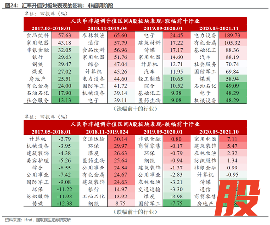 所以对于汇率正常的、非超调的升值,经济的周期性改善会给顺周期板块提供支撑。除此之外,每个时间段都有自己的特殊因素,比如2017年至2018年的供给侧改革的影响,2018年11月至2019年初流动性宽松和CPI的回升(预期),2019年第四季度则是中美达成阶段性协议的积极影响,2020年至2021年则有供给冲击(上游商品大涨价)和新能源的热潮。