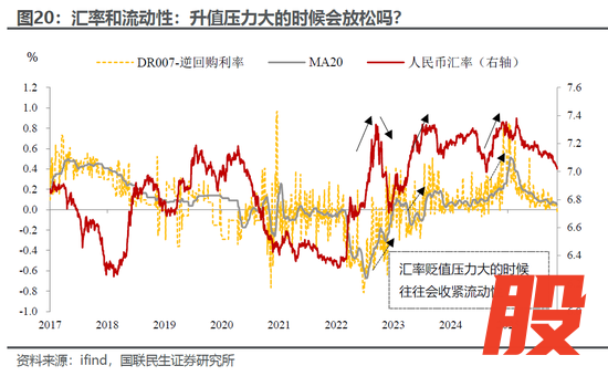 而对应流动性的情况。过去3年汇率贬值压力对于流动性确实存在约束,集中体现在当贬值压力大的时候,货币市场流动性(用DR007和7天逆回购利率之差来表示)往往会边际上收紧、波动变大。那么如果汇率转向升值趋势呢?非超调升值行情,货币市场的信号是比较中性的,体现为利差逐步向0收敛;而当汇率出现一段时间的升值超调后,确实最终会带来流动性的宽松转向,不过这个和货币政策的宽松密切相关。