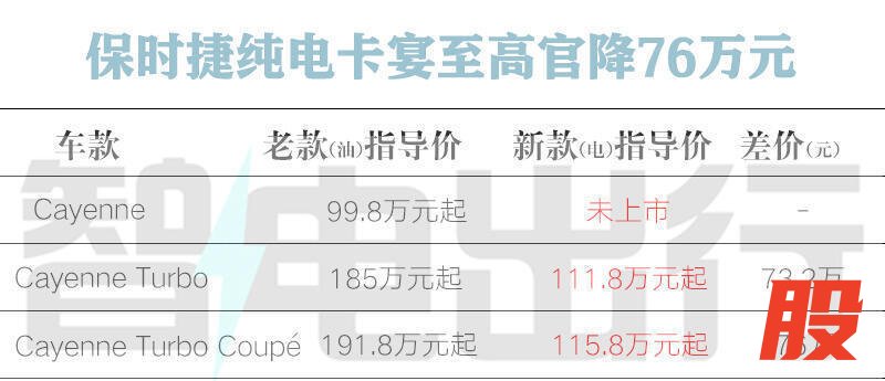 4月24日,保时捷官方公布了全新纯电动Cayenne Turbo和Cayenne Turbo Coupé中国大陆市场售价,分别为111.8万元起、115.8万元起,相比已停产的老款车型分别官降73.2万元和76万元。