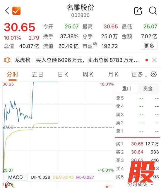早盘,人气股名雕股份(002830)盘初跌停,随后快速拉升涨停,上演“地天板”走势。截至午间收盘,名雕股份报30.65元/股,成交额7.02亿元。